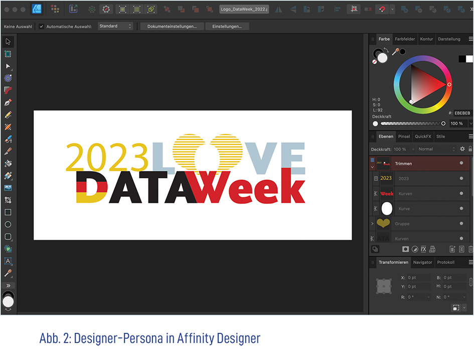 Der Designer ist vergleichbar mit Adobe Illustrator, also ebenfalls spezialisiert auf Vektorgrafiken und Illustrationen. Auch hier wird die Benutzungsoberfläche als aufgeräumt bewertet, mit der sowohl Anfänger:innen als auch Umsteiger:innen schnell zurechtkommen. Die Software bietet sowohl Vektor- als auch Rastergrafik-Werkzeuge durch die Verwendung von Personas. Somit wird eine flexible Gestaltung erlaubt. Sehr angenehm beim Arbeiten mit Affinity Designer ist die Echtzeitvorschau, was insbesondere bei komplexen Effekten und Designs hilfreich ist. Weiterhin sind umfangreiche Typografie-Werkzeuge vorhanden, die ein ansprechendes und intuitives Design ermöglichen.