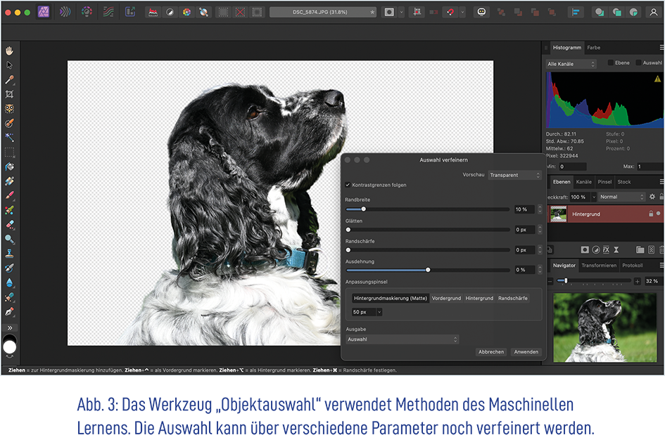 Bei den Affinity-Produkten noch nicht so stark ausgeprägt ist bisher die Integration von KI-Technologien in den Workflow. Hier hat derzeit Adobe noch einen Vorsprung, ansonsten sind die Software-Lösungen von Affinity aber eine ernstzunehmende Alternative zu den bisherigen Platzhirschen. Seit der Version 2.6 (Feb 2025) verwenden die Affinity-Anwendungen Datenmodelle und Methoden des Maschinellen Lernens, um automatisch Objekte in einer Pixelebene oder einem platzierten Bild auswählen zu können.