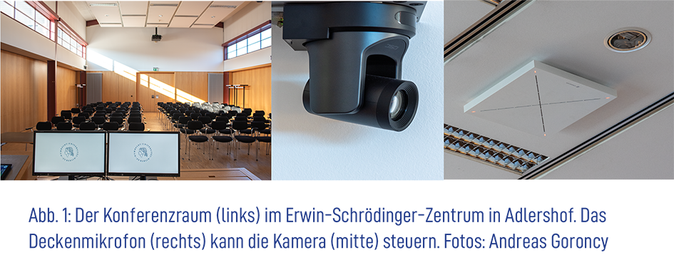 Beim Umbau des Konferenzraums sollte ein anderer Ansatz getestet und umgesetzt werden: Das Kameratracking sollte mittels eines Deckenmikrofons für Veranstaltungen und Workshops und zusätzlich über ein Setting mit Tischmikrofonen, z. B. für Sitzungen des Akademischen Senat (AS), erfolgen.