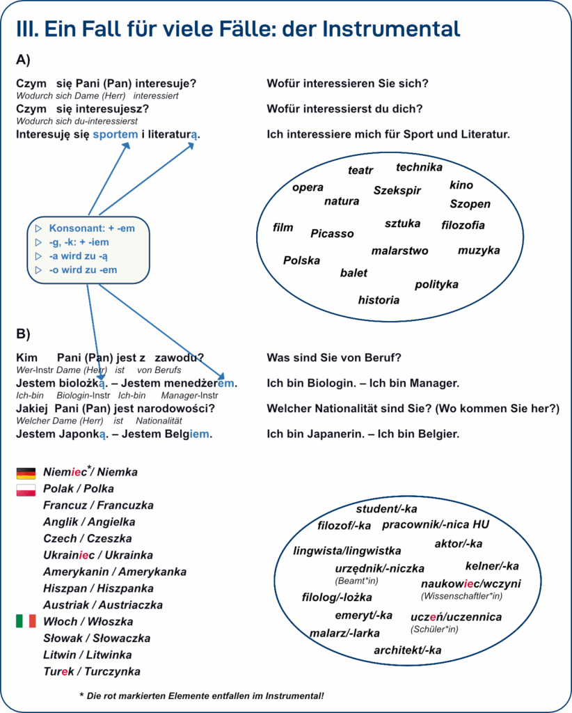 Ergänzen Sie bitte mit Hilfe des Vokabulars im III. Teil des Posters und der dort zu findenden Bildungsregel für den Instrumental sowie aufgrund Ihres allgemeinen Wissens die folgenden Sätze. („Bauen“ Sie dabei jedes Substantiv aus zwei Teilen – dem Stamm und der passenden Endung – zusammen.)