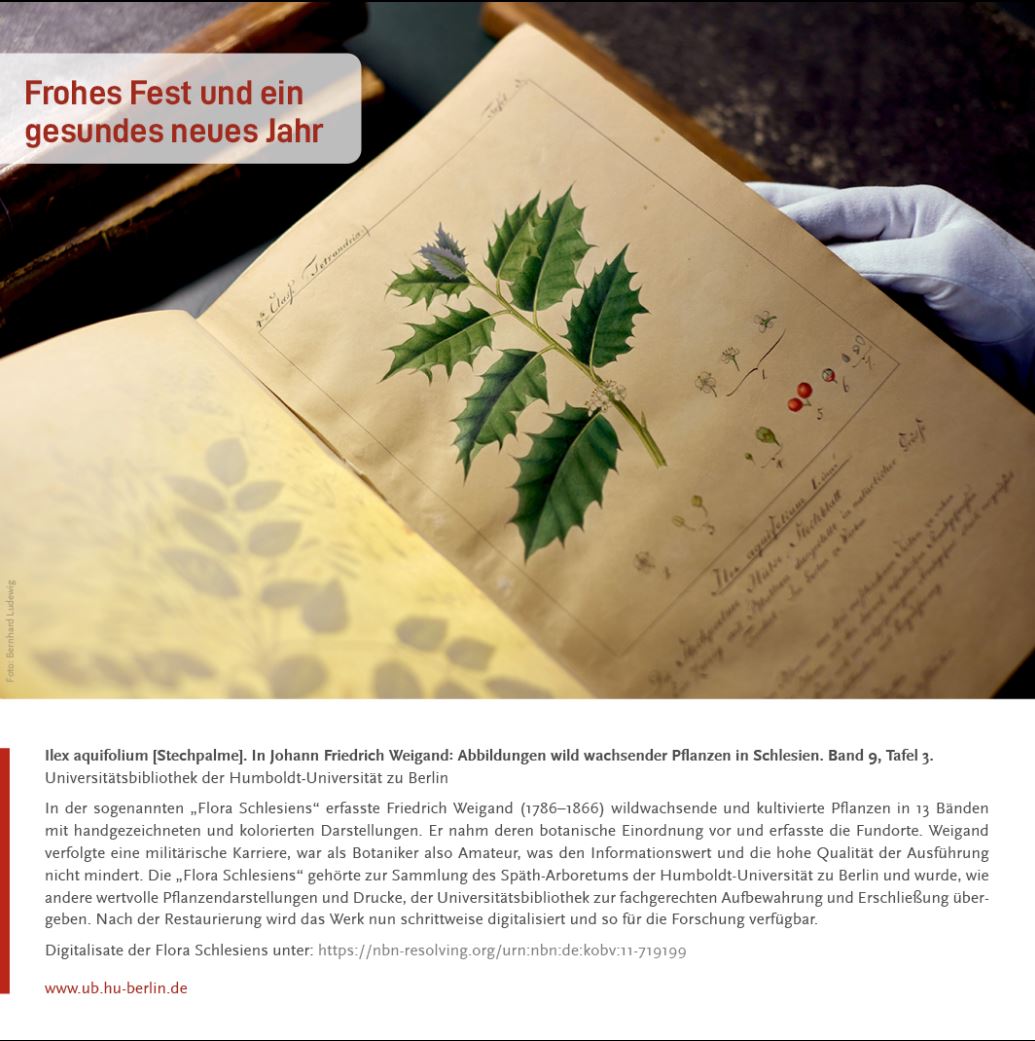 Noch ein Lesetipp zum Jahresausklang: In unserem Jahresbericht erfahren Sie, was an der Universitätsbibliothek 2023 alles passiert ist. Verschiedene Pflanzenmotive aus dem ersten Band des 1808-1809 publizierten Werks „Plantes Équinoxiales“ von Alexander von Humboldt und Aimé Bonpland führen durch den Jahresbericht und seine einzelnen Rubriken. Wir geben Einblicke in diverse Projekte an der UB (Provenienzforschung, Retrodigitalisierung), ein Jubiläum in Adlershof, neue Solo- und Meetingboxen, orientalische Handschaften, virtuelle Lehrbuchsammlungen u.v.m. Wir wünschen Ihnen eine spannende Lektüre!